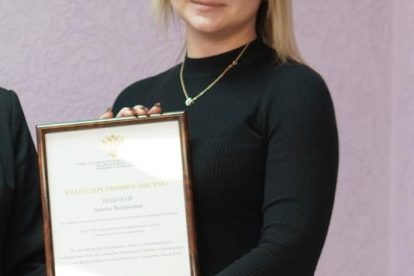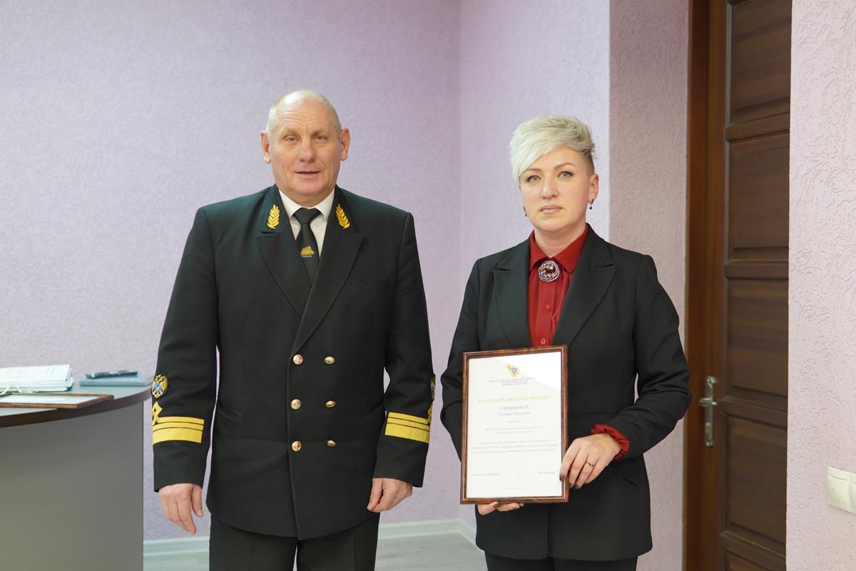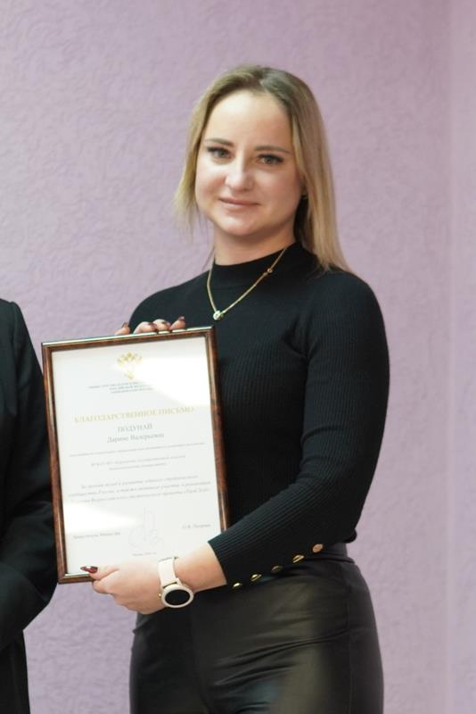 Проректор Глечикова Татьяна Олеговна отметила значительный вклад и вручила благодарность от заместителя Министра науки и высшего образования Российской Федерации Петровой Ольги Викторовны за личный вклад в развитие единого студенческого сообщества России, а также активное участие в реализации 5 сезона Всероссийского студенческого проекта «Твой Ход»: